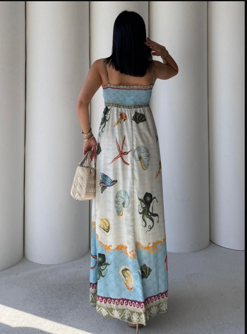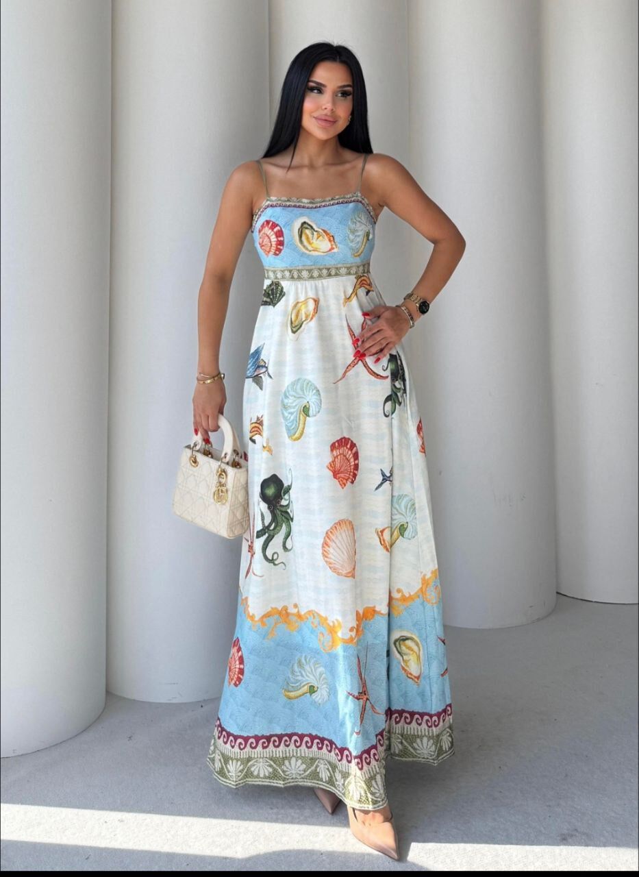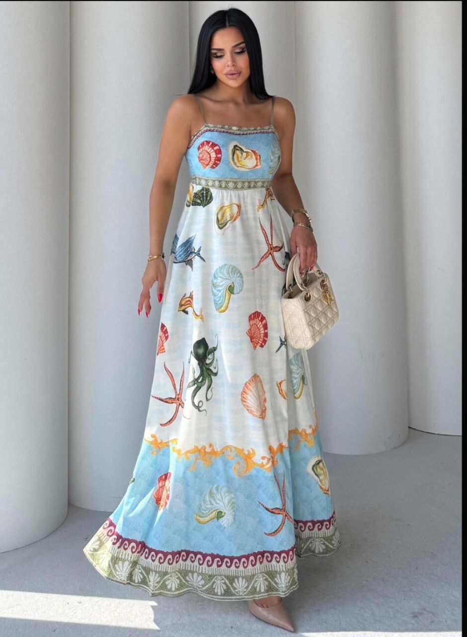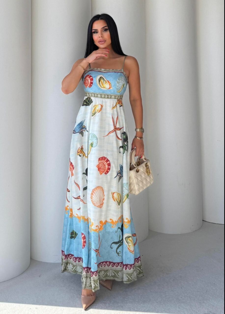 DESENLİ KARE YAKA ASKILI ELBİSE