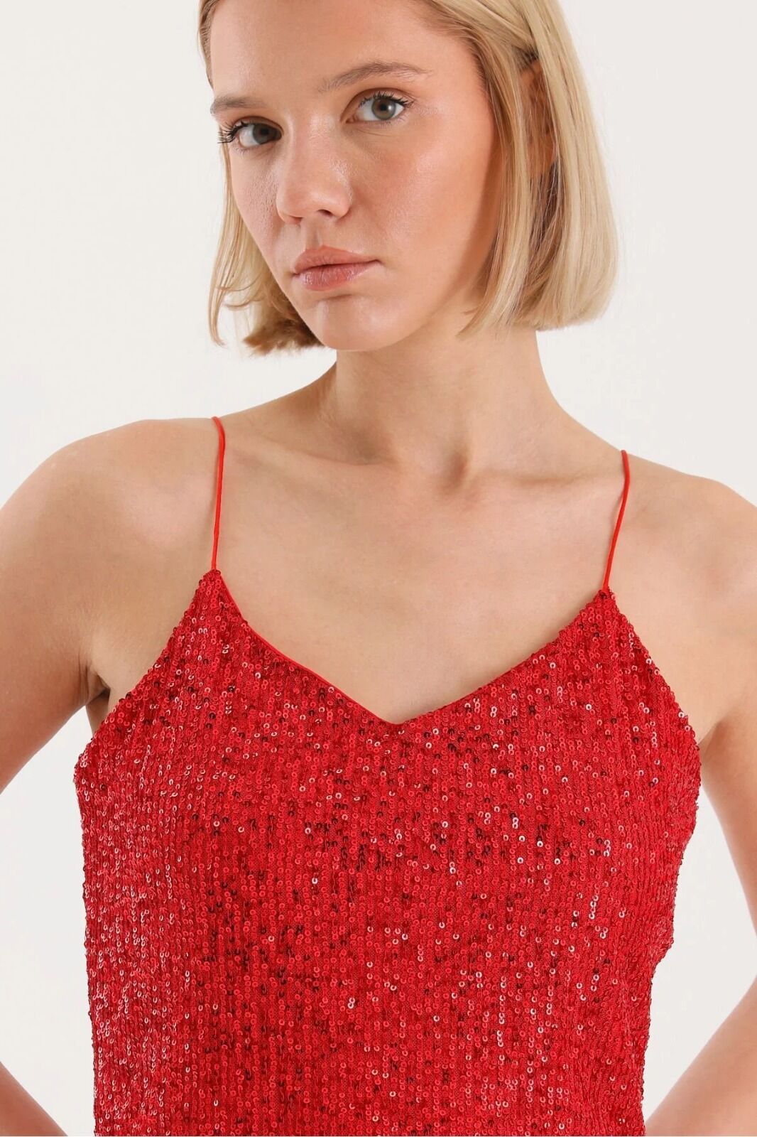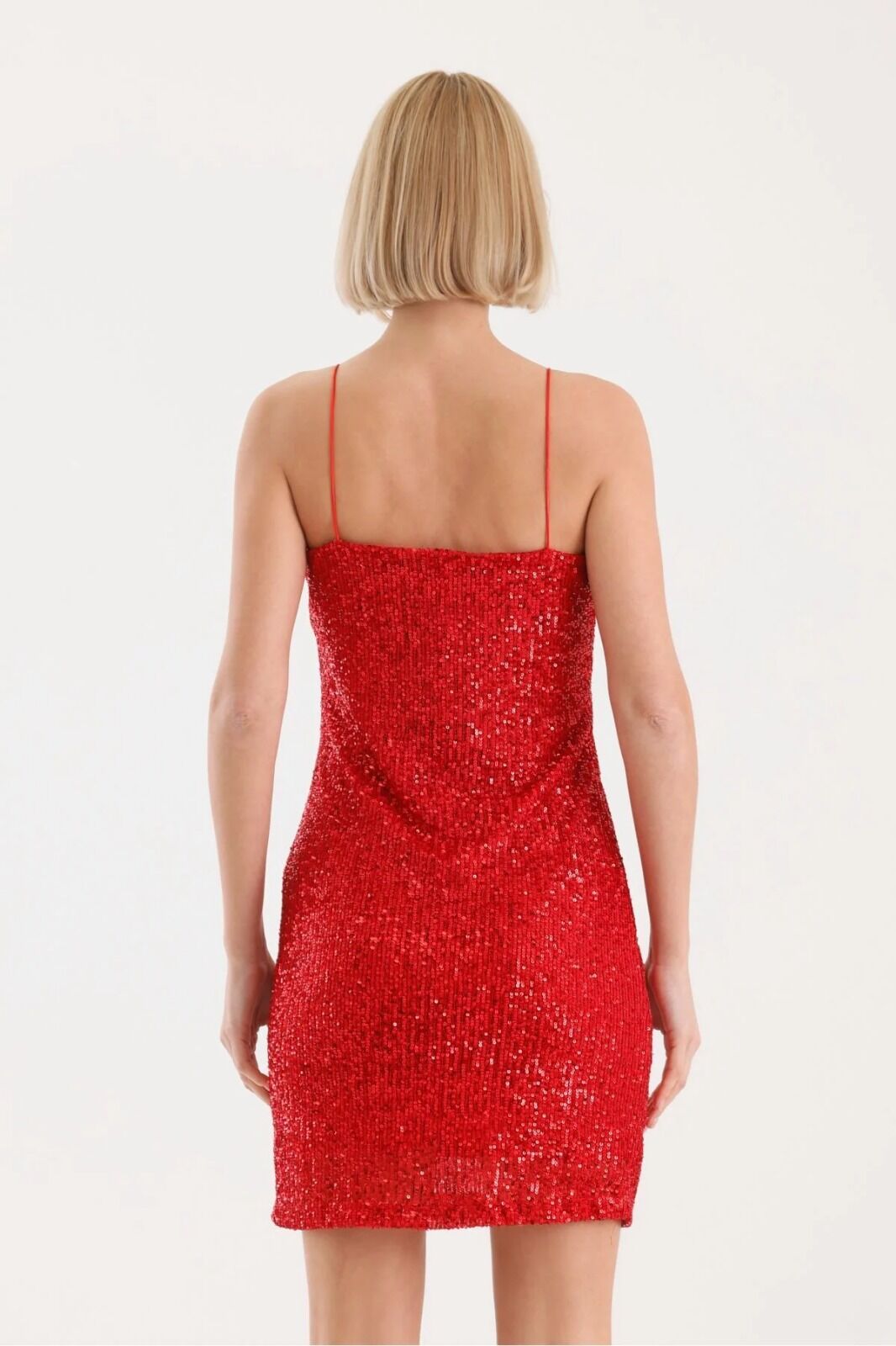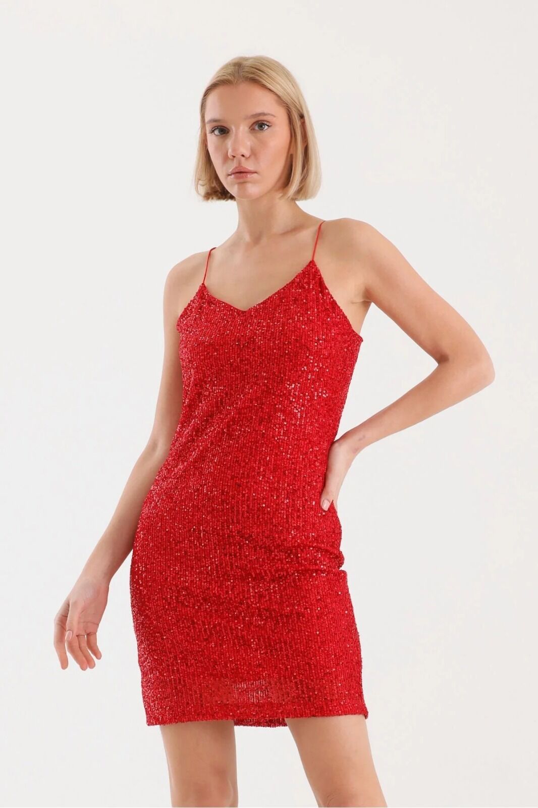 İp Askılı Pullu Kumaş Mini Boy Parlak Elbise