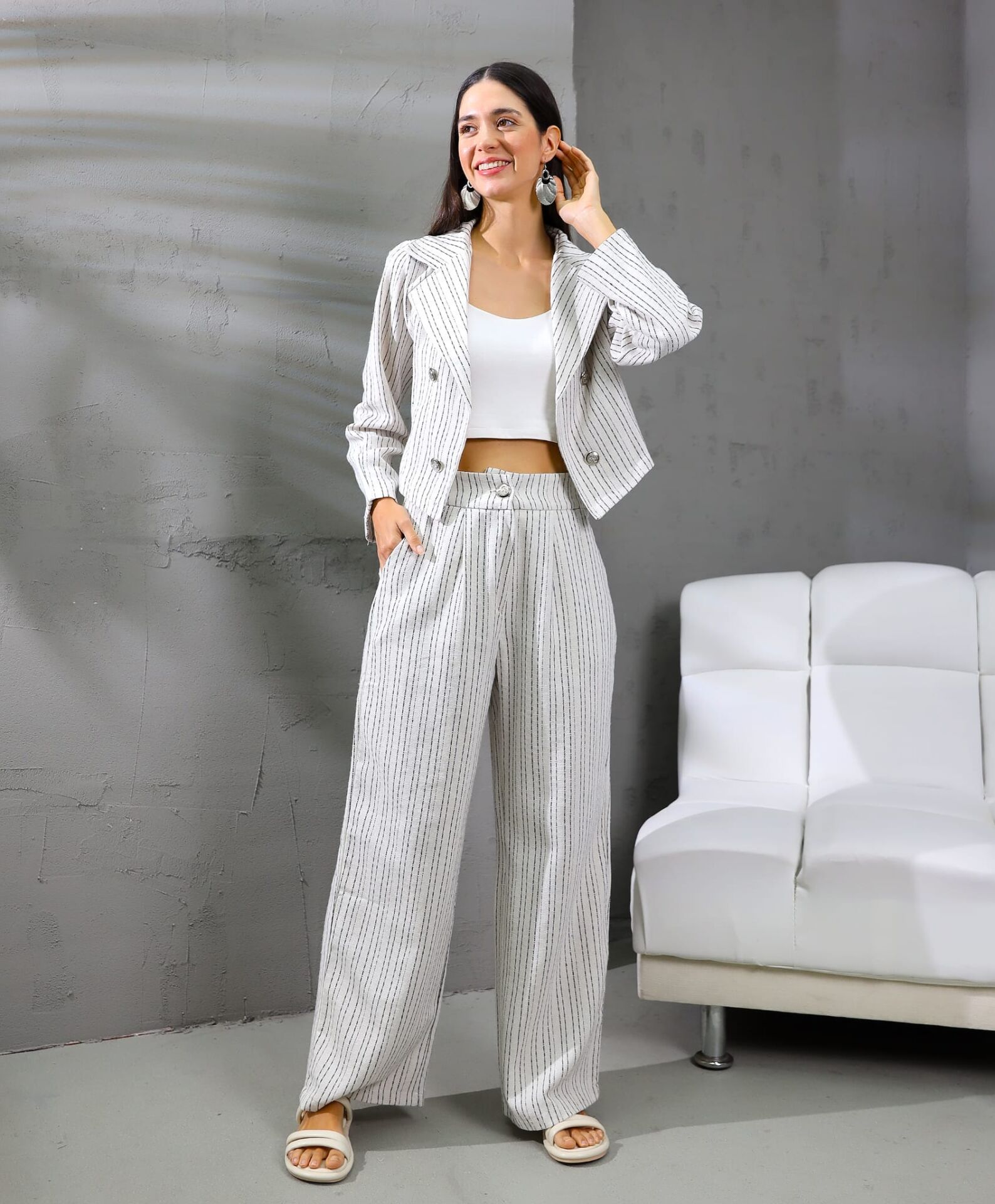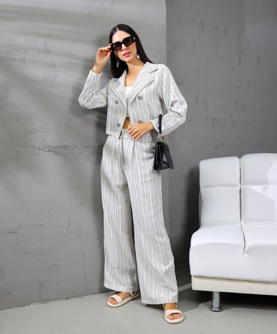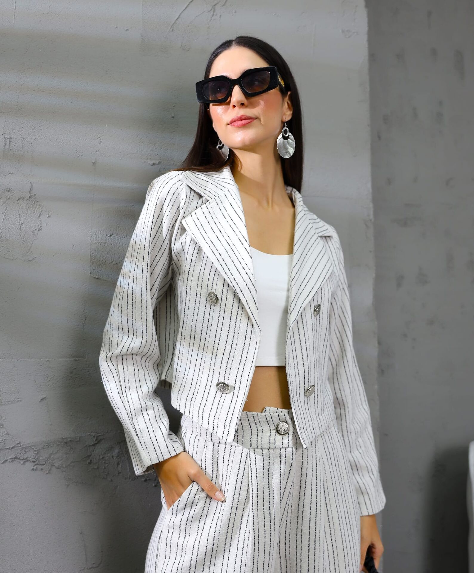 Çok şık takım. Caket, crop, pantalon.