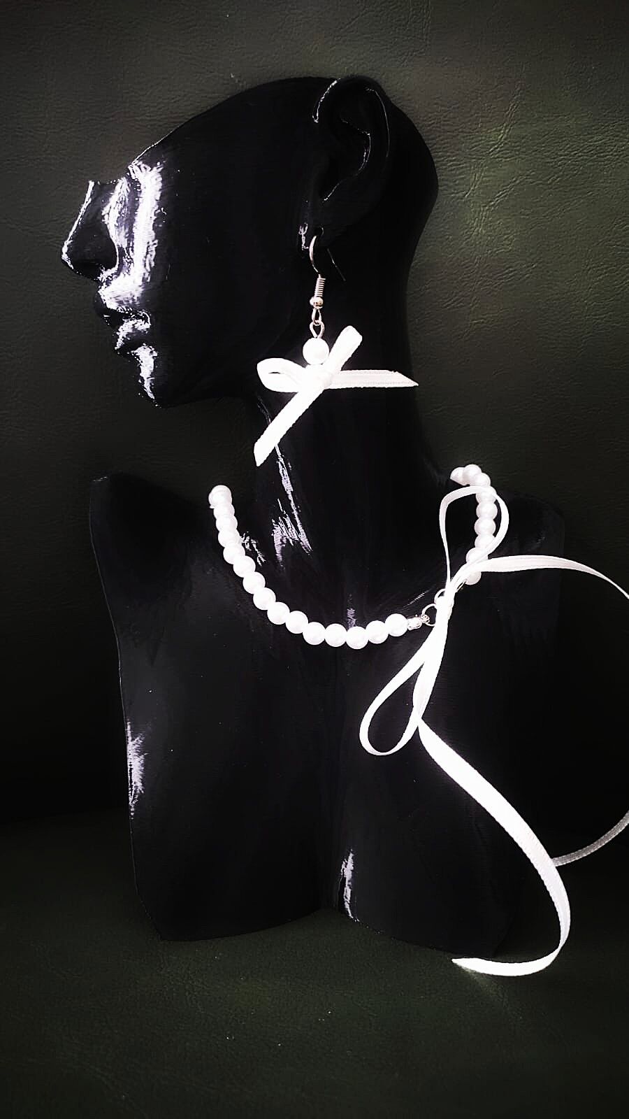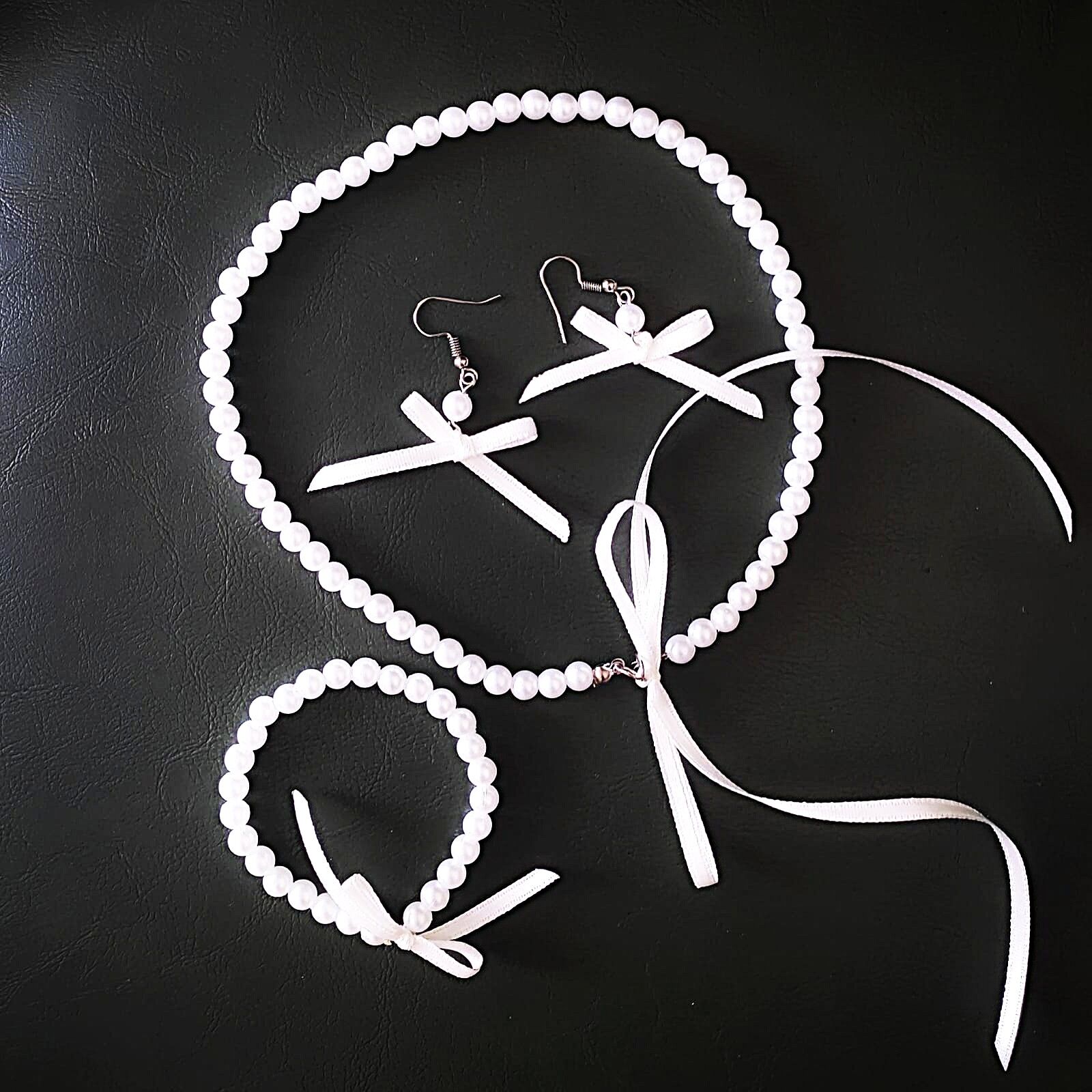 İNCİ KURDELELİ BEYAZ KOLYE KÜPE BİLEZİK TAKIMI