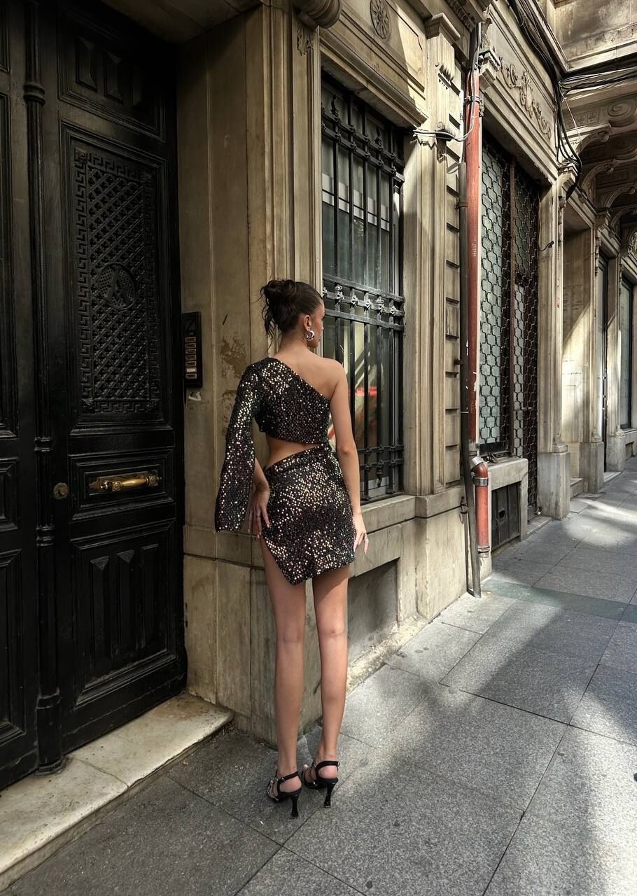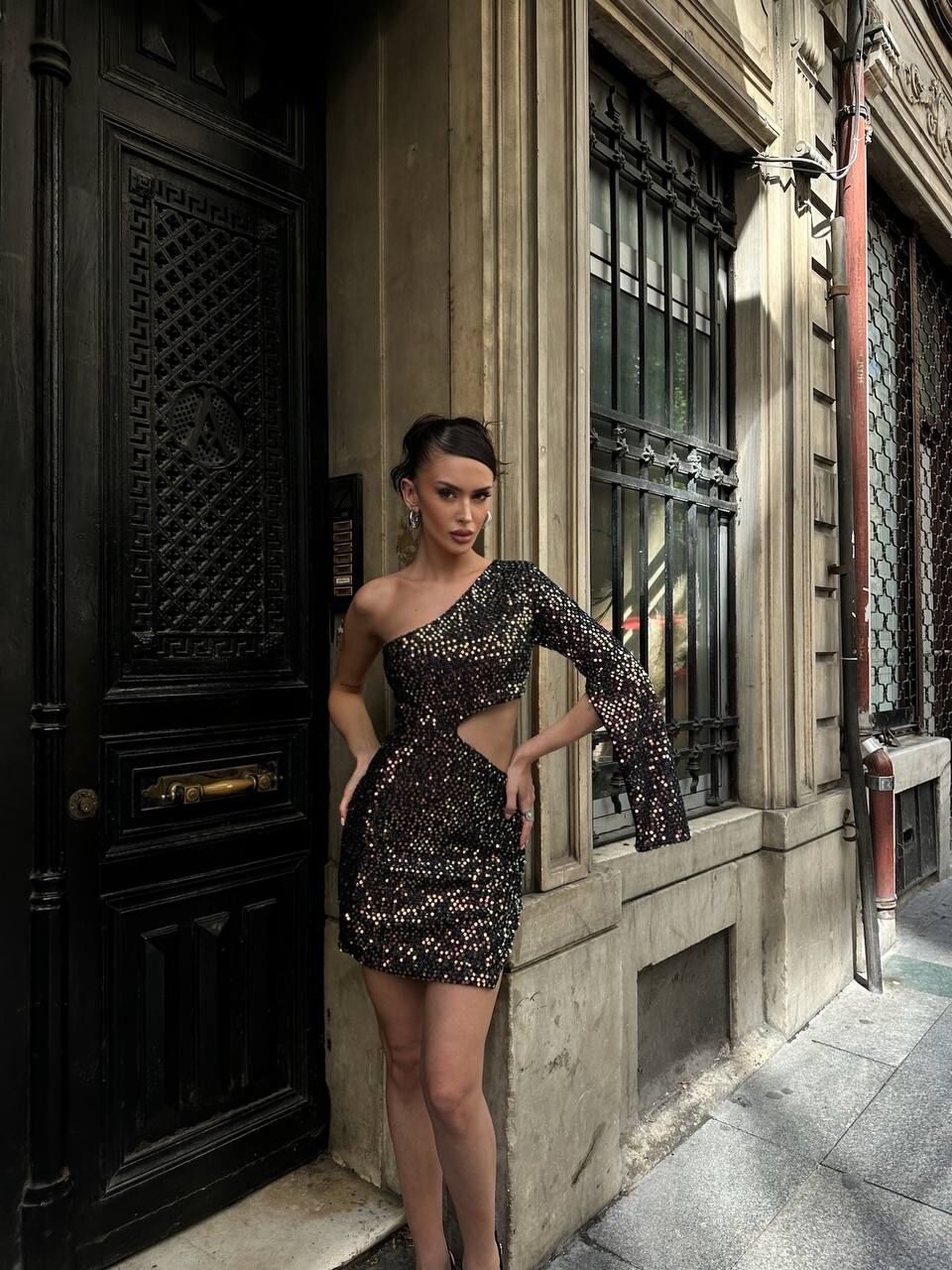 PULLU BUZY KUMAŞ TEK KOLLU ELBİSE / GOLD