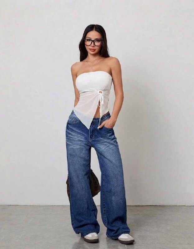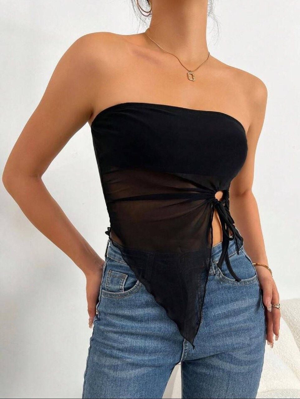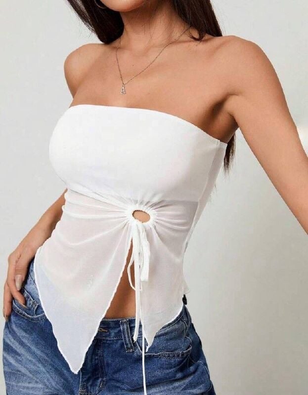 Straplez Tül Detaylı Büzgülü Crop Bluz